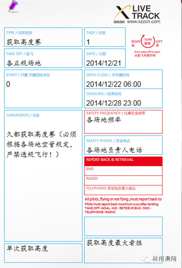 本次任务为获取高度赛,飞行员可在任意场地参加比赛,比赛时间为2014年12月22日早6点至2014年12月28日晚23点。在比赛时间内,飞行员可在多个场地多次飞行并通过追踪系统实时上传飞行数据,服务器将自动计算每位飞行员的单次获取高度。比赛结束以单次获取高度最大者获胜,奖品由极限追踪快递发出,邮费到付!